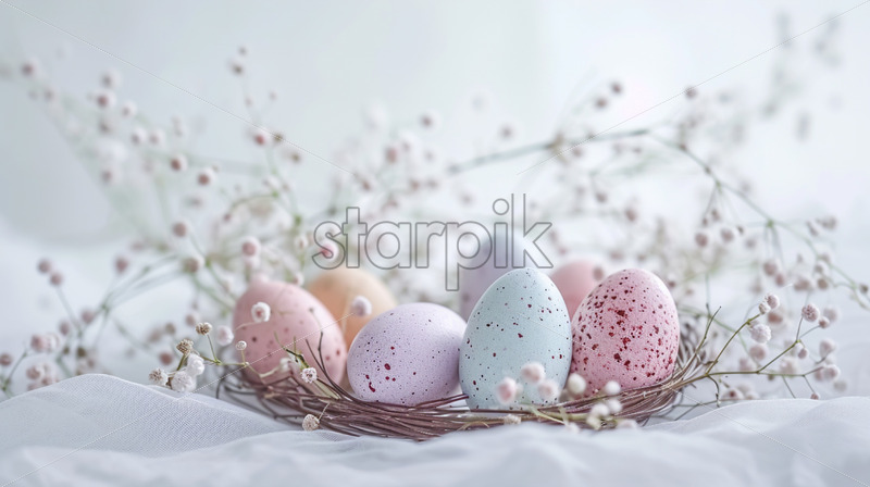 Easter postcard with pastel-colored easter eggs surrounded by cherry blossoms
