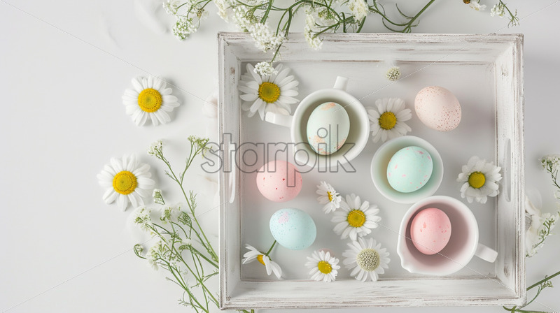 Easter postcard with pastel eggs on a vintage tray with teacups and daisies on white background