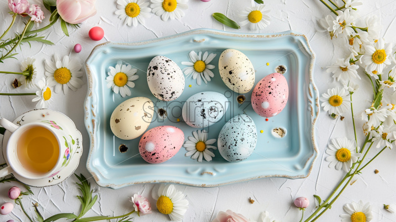 Easter postcard with pastel eggs on a vintage tray with teacups and daisies on white background