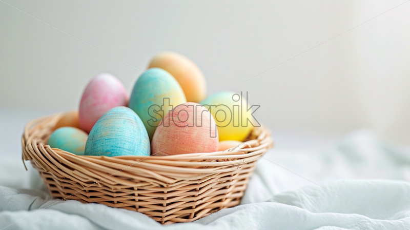 Easter postcard with pastel rainbow eggs in a wicker basket