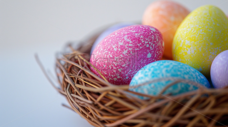 Easter postcard with pastel rainbow eggs in a wicker basket