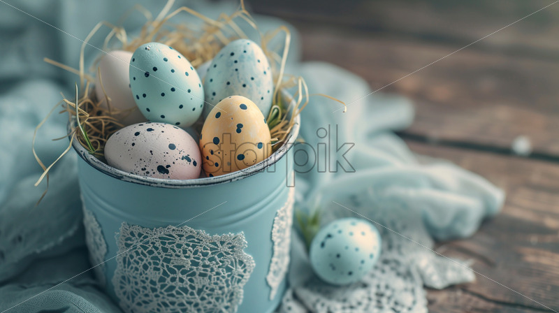 Easter postcard with polka-dot eggs in a vintage container on a lace doily
