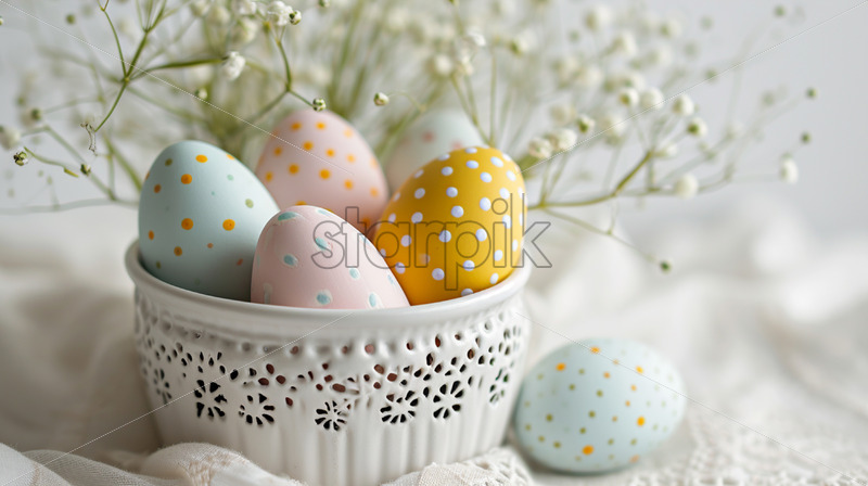 Easter postcard with polka-dot eggs in a vintage container on a lace doily