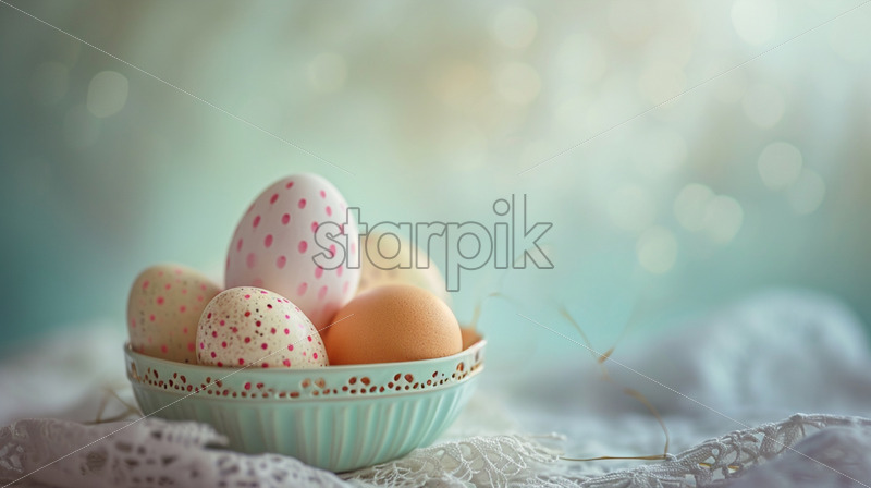 Easter postcard with polka-dot eggs in a vintage container on a lace doily
