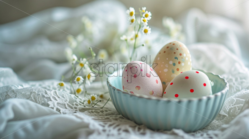 Easter postcard with polka-dot eggs in a vintage container on a lace doily