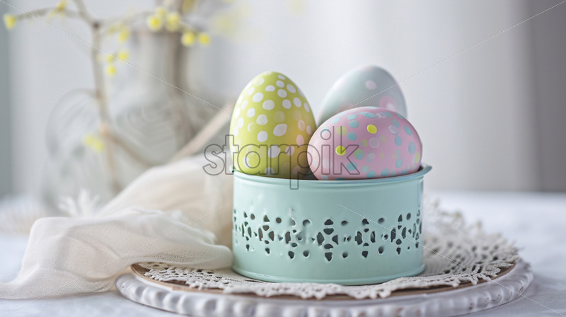 Easter postcard with polka-dot eggs in a vintage container on a lace doily