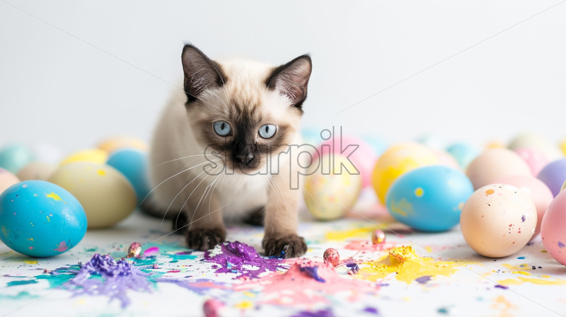 Easter postcard with siamese cat surrounded by spilled paint and half-painted easter eggs