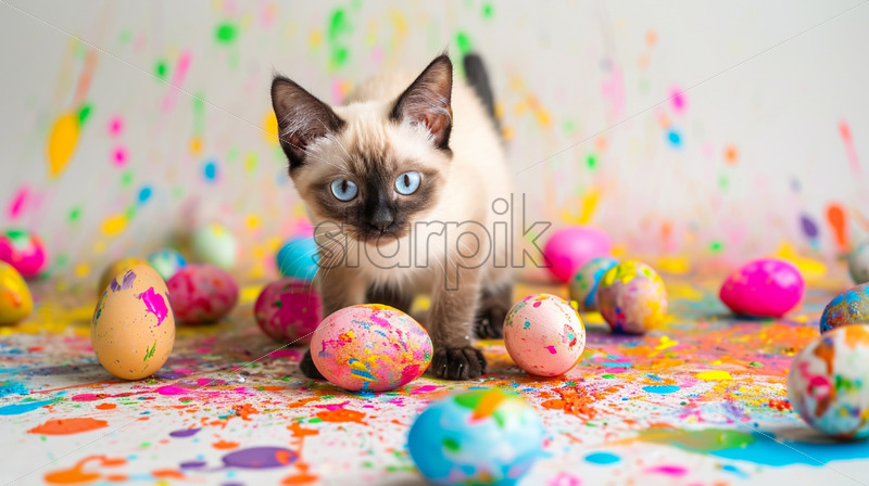 Easter postcard with siamese cat surrounded by spilled paint and half-painted easter eggs