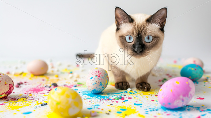 Easter postcard with siamese cat surrounded by spilled paint and half-painted easter eggs