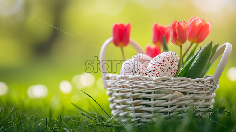 Easter postcard with tulips and speckled eggs in a white basket on grass