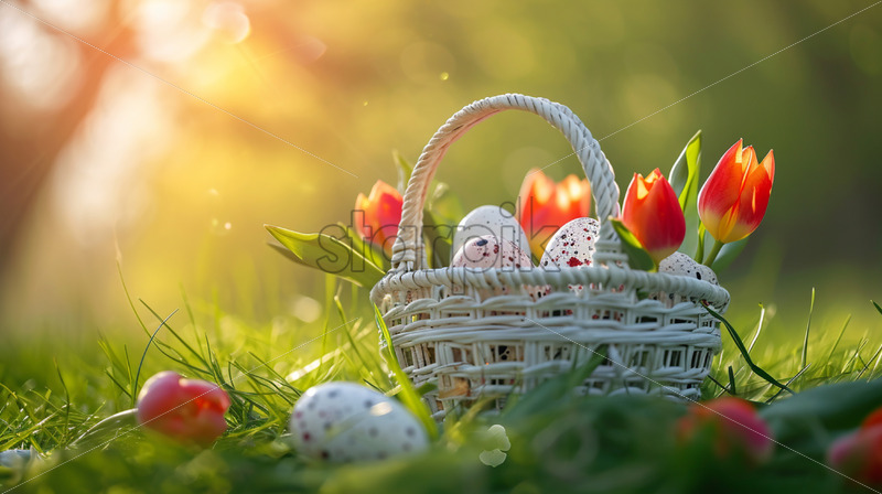 Easter postcard with tulips and speckled eggs in a white basket on grass