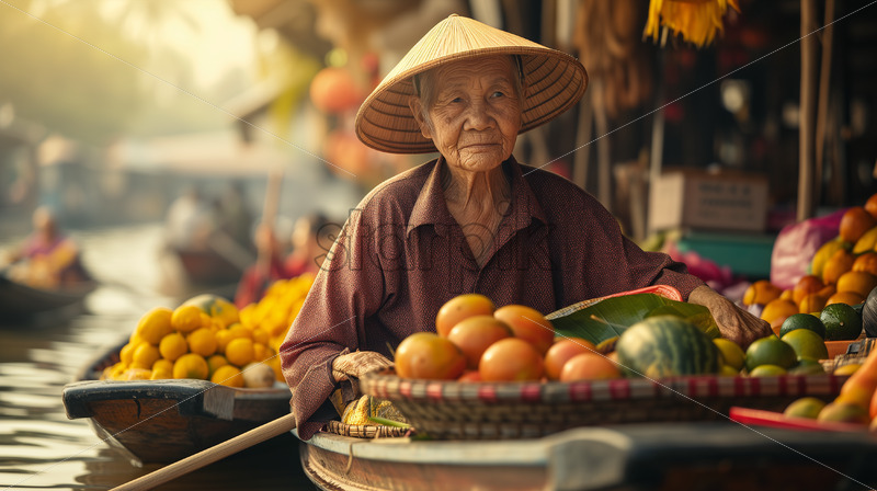 Experience the lively ambiance of a traditional Thai floating market through this dynamic photograph featuring a full-body shot of an elderly female vendor. Amidst the vibrant boats and soft natural light, the scene exudes warmth and hustle and bustle. Adorned with a traditional Thai hat and surrounded by colorful fruits, the photo encapsulates the richness of Thai culture and the abundance of local produce.