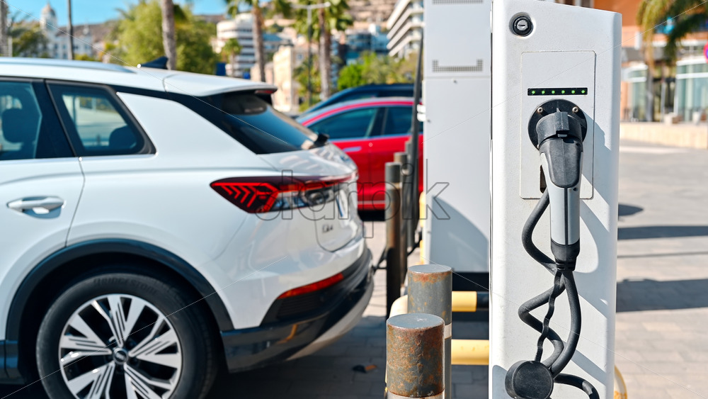 A young man with smartphone at a car charging station and charging electric car nearby. Chisinau, Moldova