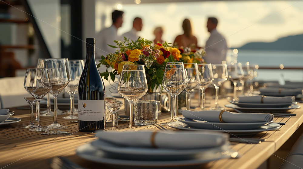 Home » Shop » AI Illustration » elegant table on a yacht with glasses and food prepared for a party