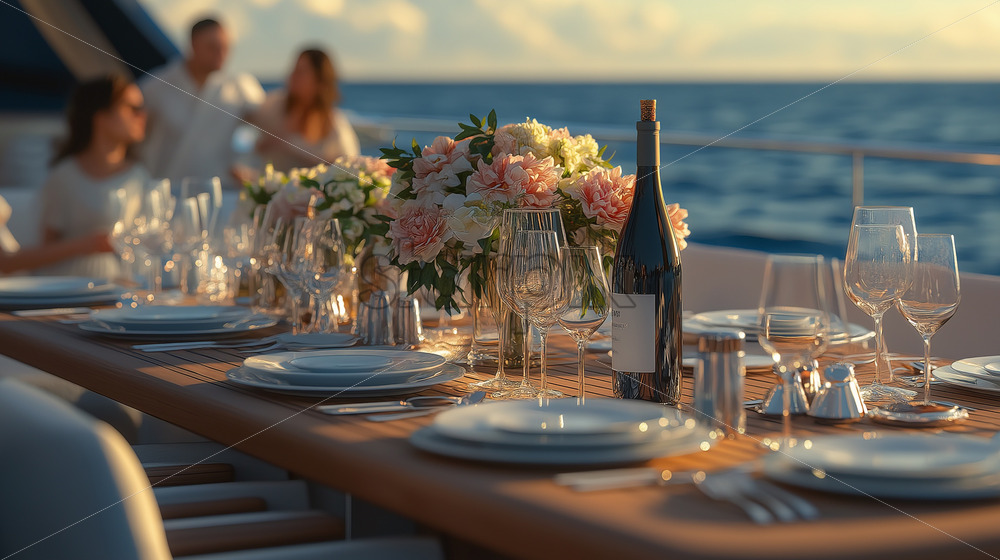 elegant table on a yacht with glasses and food prepared for a party