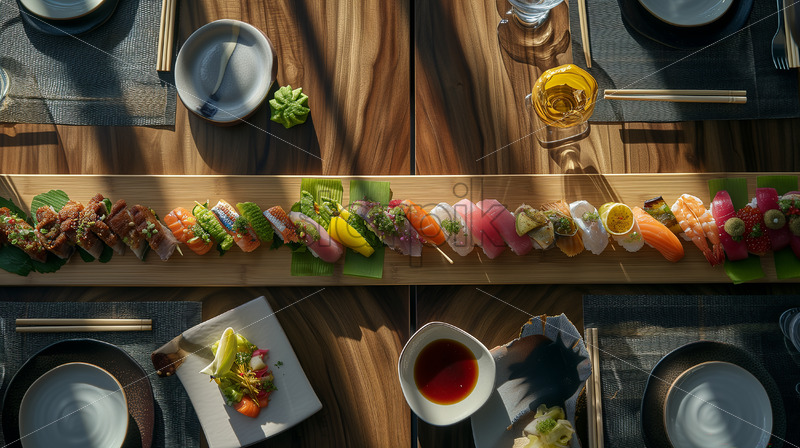 An alluring top-view photograph capturing the refined presentation of Japanese sushi, featuring vinegared rice adorned with a delightful array of ingredients like fish, vegetables, and tropical fruits. The artful arrangement graces traditional Japanese dishware, accompanied by gracefully placed chopsticks, set in either a traditional Japanese dining room or a minimalist modern setting. Soft natural light enriches the vibrant colors and textures, with a dedicated focus on simplicity and symmetry. Props such as Japanese ceramics, bamboo placemats, and elegant chopsticks add to the visual allure.