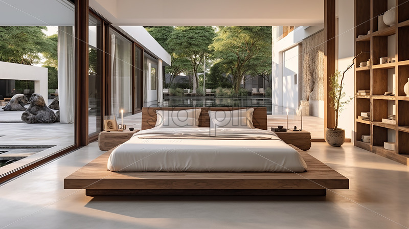 Elegant vacation house in the beach side, clear glass wall with wood and white theme, wood bedframe , wooden shelves, swimming pool and indoor plants with cozy vides