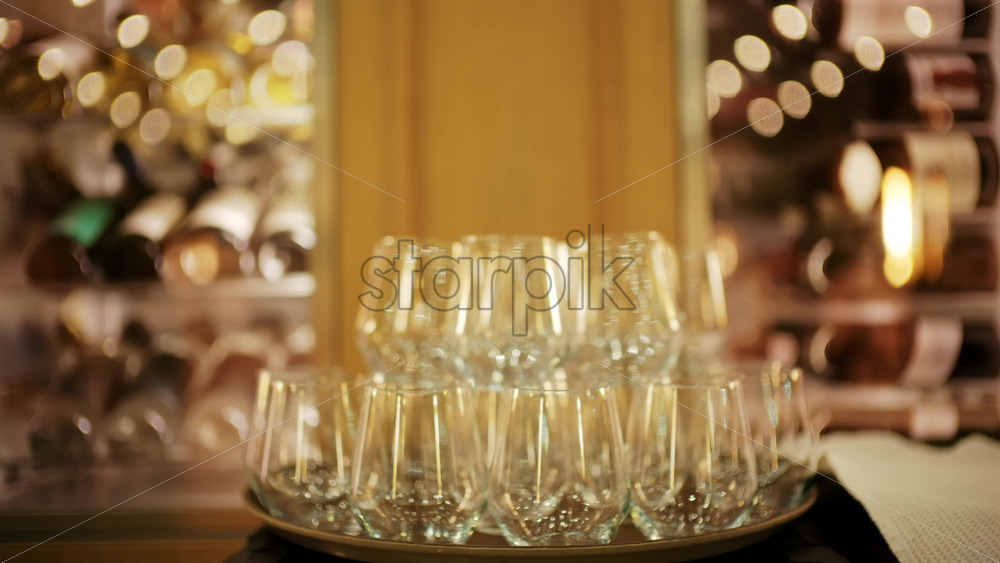 Elegant wine glasses arranged on a tray in a softly lit restaurant setting, with wine racks blurred in the background