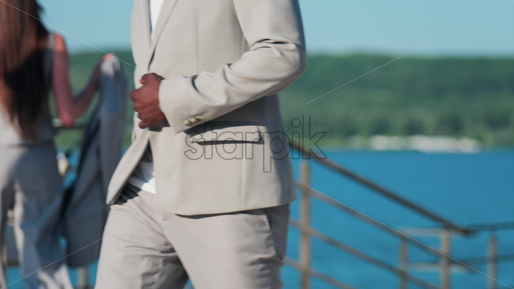 Elegantly dressed man and woman walking on a scenic terrace with a view of a calm body of water Royalty Free Stock Video Footage