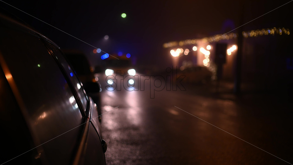 Emergency vehicle approaching along a wet city street at night with blue lights flashing