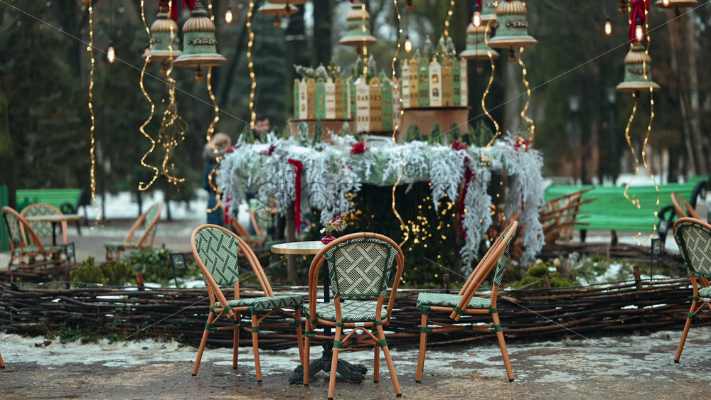 Empty outdoor cafe tables and chairs in a park decorated with winter garlands, lights, and ornaments