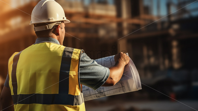 A focused construction worker in uniform diligently repairs equipment on the dirt ground of a construction site, with a blurred background of ongoing activities.