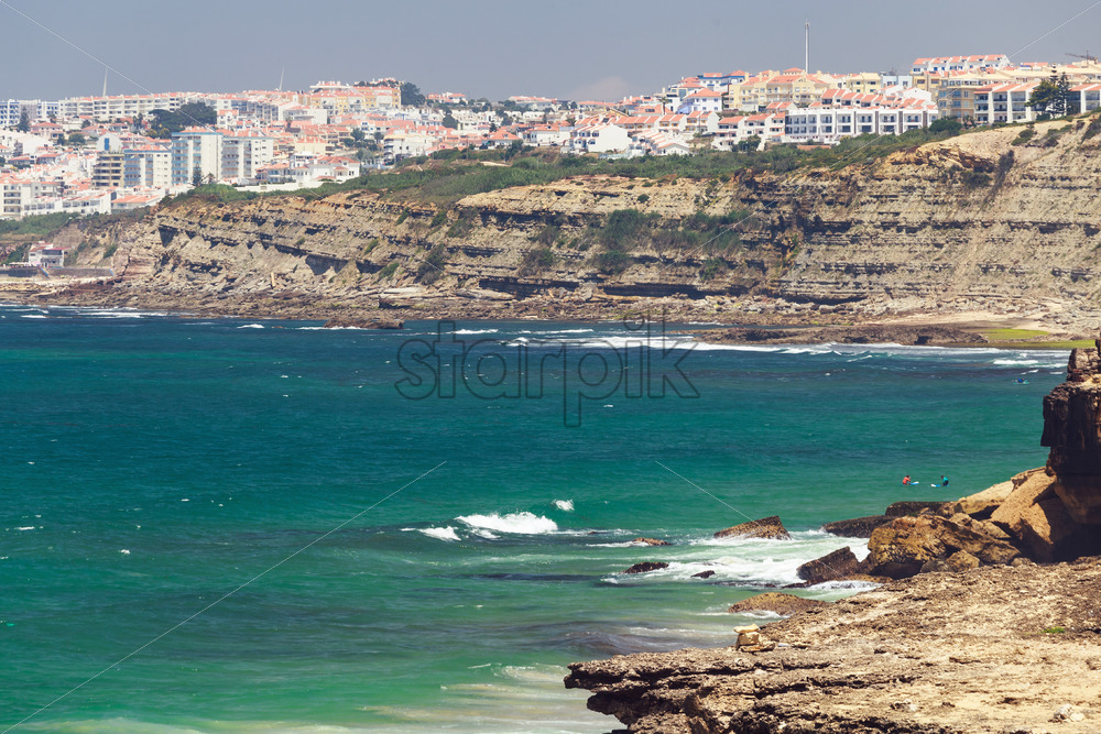 NIKITI, GREECE – OCTOBER 8, 2020: Beach on Aegean sea coast with resting people, umbrellas and sunbeds, rocks in the water, embankment street Royalty Free Stock Video Footage