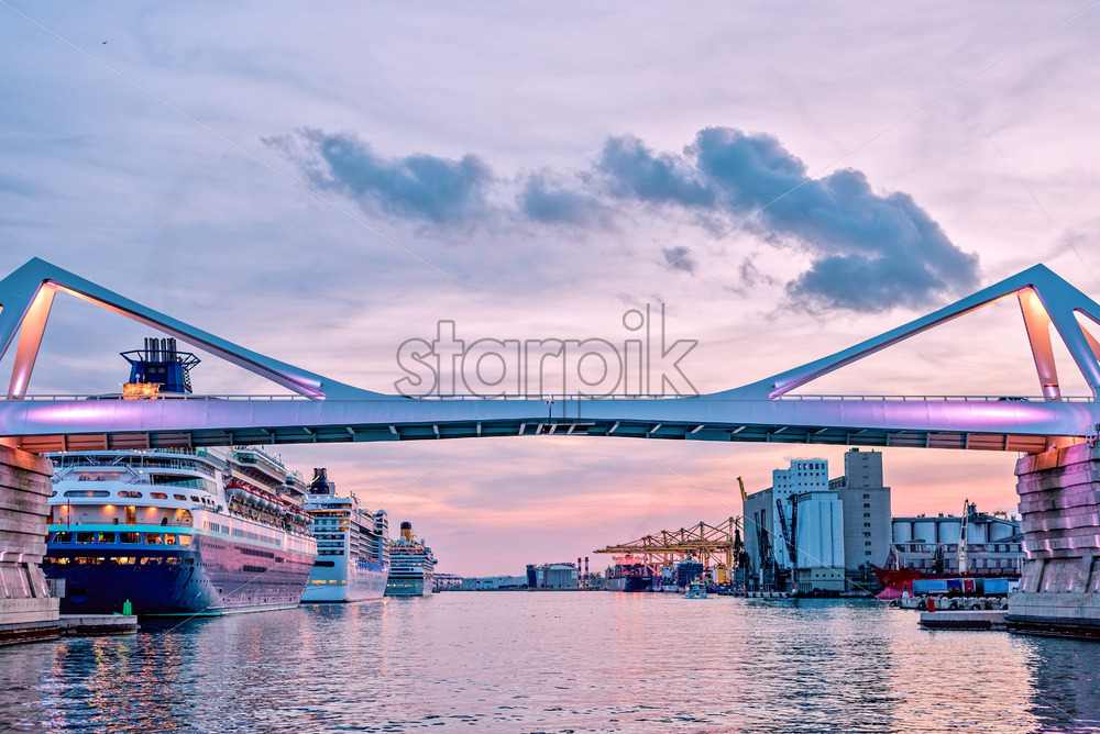 Europa Bridge at the entrance to Port Vell Barcelona, Catalunya Spain. Beautiful peaceful view sunset sky