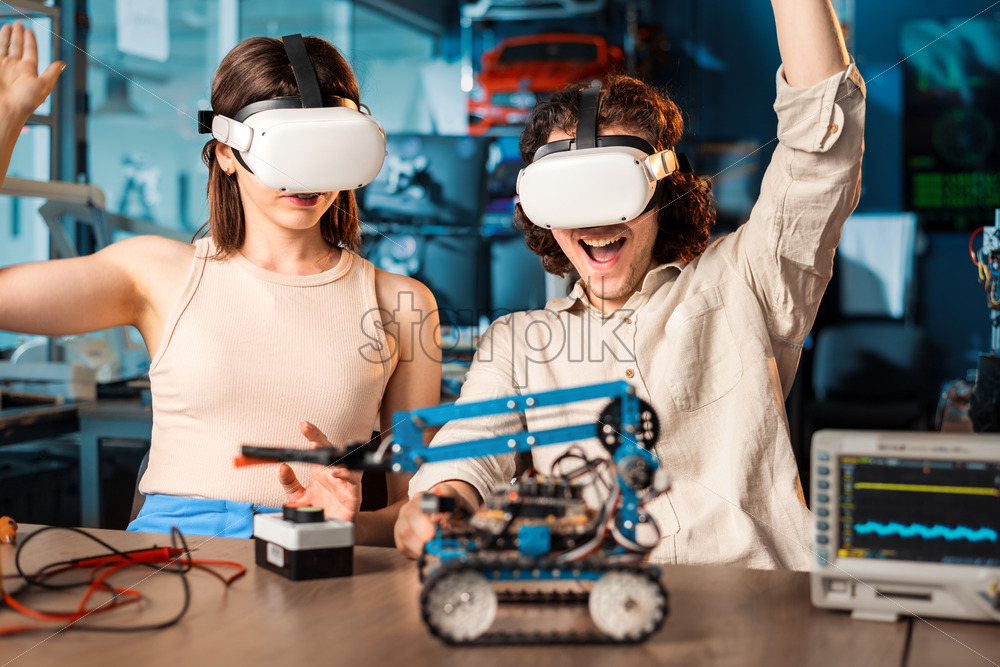 Excited young man and woman in VR glasses doing experiments in robotics in a laboratory. Robot and tools on the table