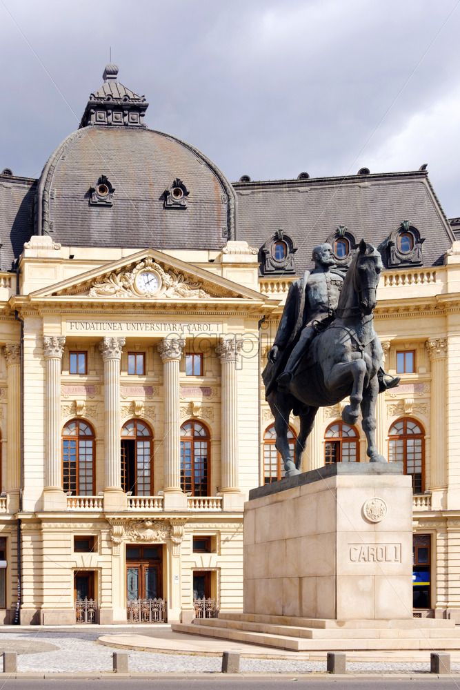 BUCHAREST, ROMANIA- 9 JANUARY, 2020: Central University Library Carol I, Equestrian monument to Carol I