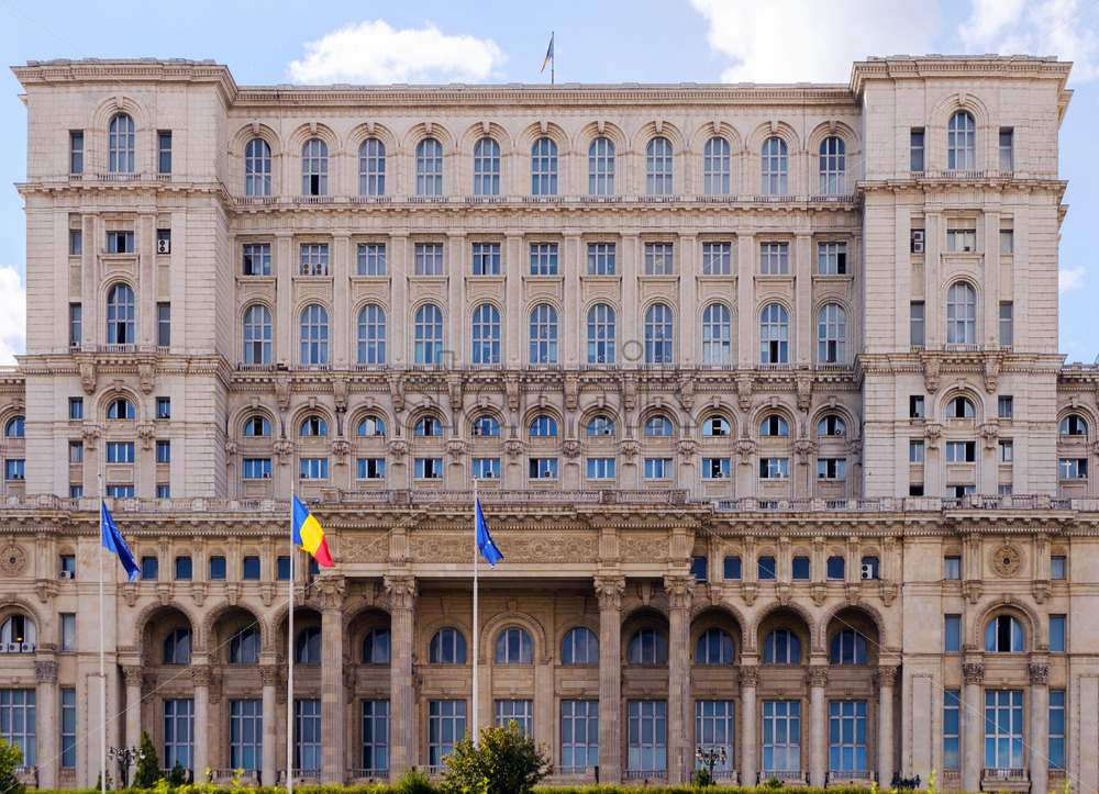 Wide view of the Palace of the Parliament in Bucharest, Romania. Garden in front of it
