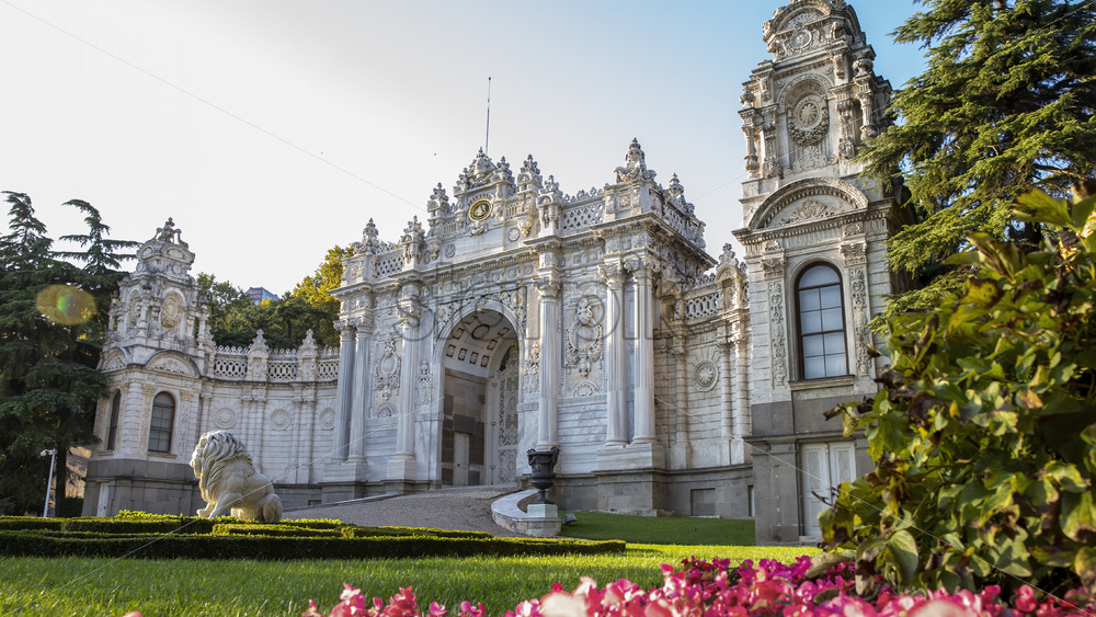 Facade of the Dolmabahce Palace with gardens full of greenery and flowers in front of it in Istanbul, Turkey