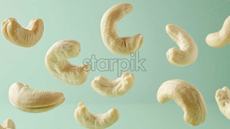 Falling cashew nuts on a pale green background