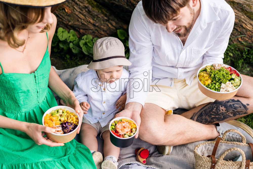 Family at a picnic eating poke in the park on a sunny summer day