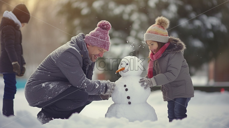 Dad and kids winter time, spending time together outdoors, walking in a forest