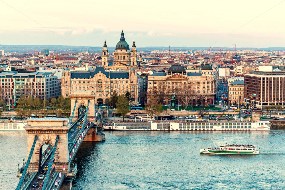 Famous chain bridge and Danube river with ships at sunset. Aerial view. Negative copy space, place for text. Budapest, Hungary Royalty Free Stock photo