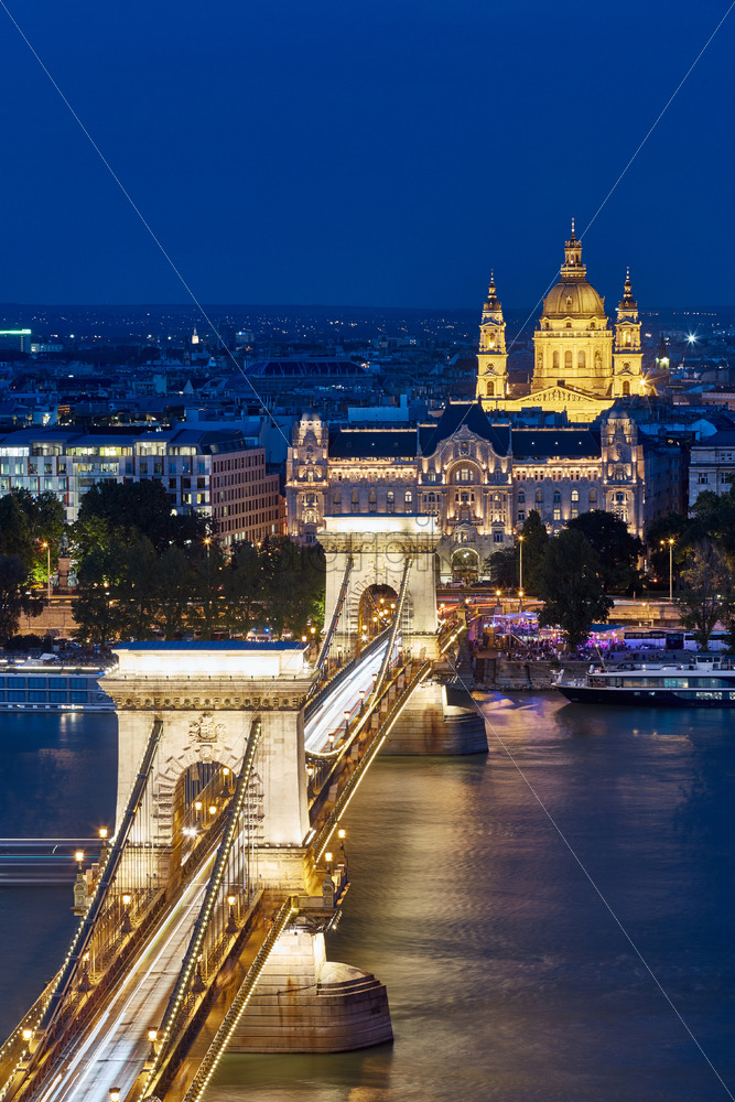 Famous chain bridge at night with illuminated St Stephen’s Basilica on background. Long exposure. Budapest, Hungary