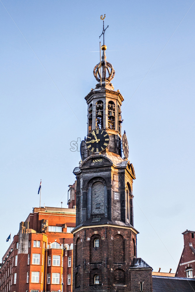 Home » Shop » photo » Famous Mint Tower at sunset from bottom. Bright blue sky with clouds on background. Amsterdam, Netherlands