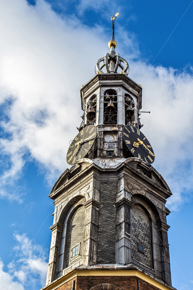 Famous Mint Tower at sunset from bottom. Bright blue sky with clouds on background. Amsterdam, Netherlands Royalty Free Stock photo