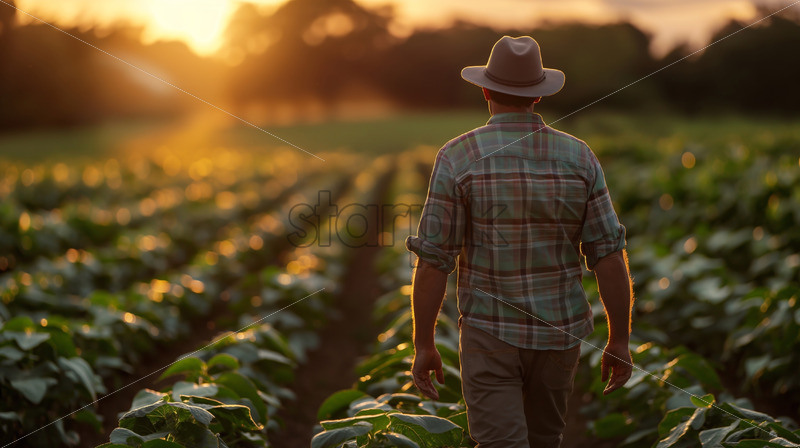 Farmer inspecting his land harvest at sunset