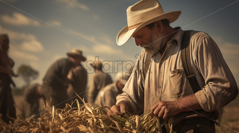 A diligent potato farmer in the expansive potato fields during a bright afternoon, with the focus on the basket filled with freshly dug potatoes.