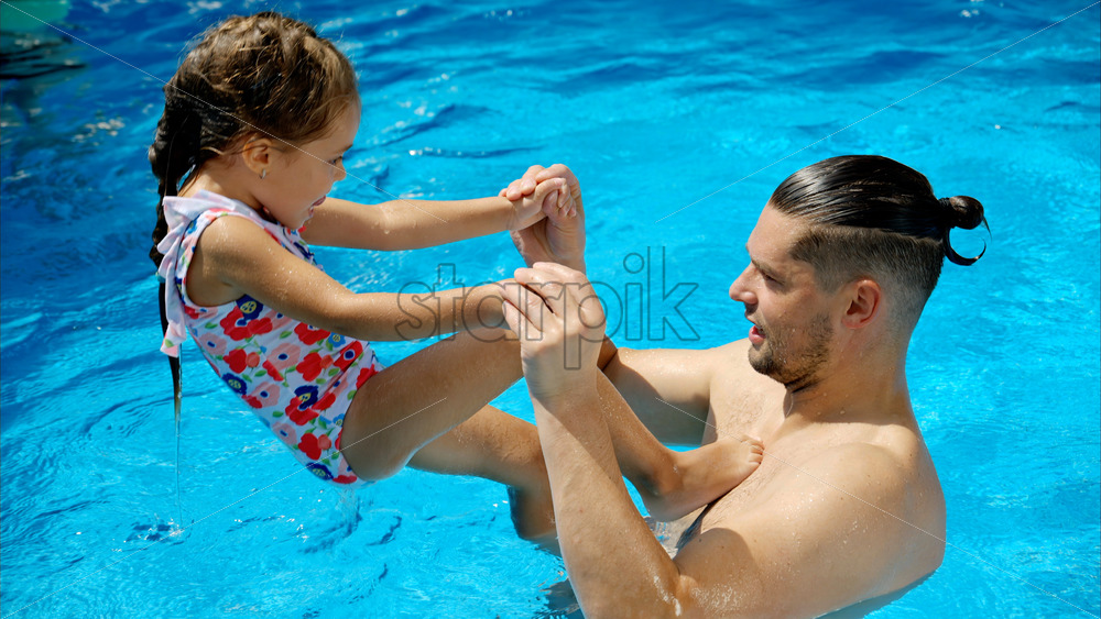 Mother with father and daughter resting and swimming in a pool in summer, happy family kissing