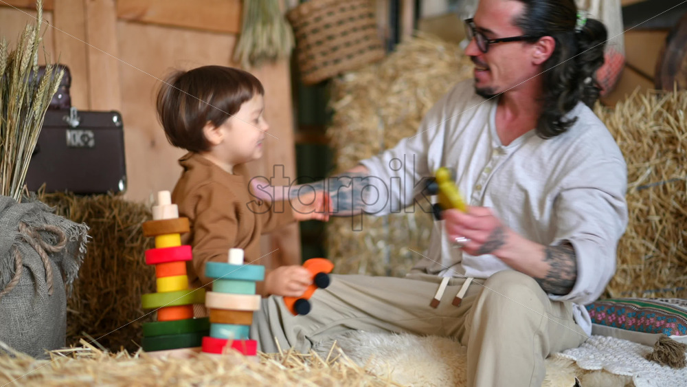 Father playing with his son with colourful, ecological wooden toys in a barn, near square hay bales Royalty Free Stock Video Footage Royalty Free Stock Video Footage