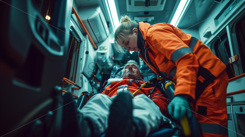 A poignant photograph capturing a dedicated female paramedic during an emergency, preparing to unload an elderly patient lying on a stretcher inside the ambulance, both clad in orange suits, showcasing the compassionate care provided by healthcare professionals.