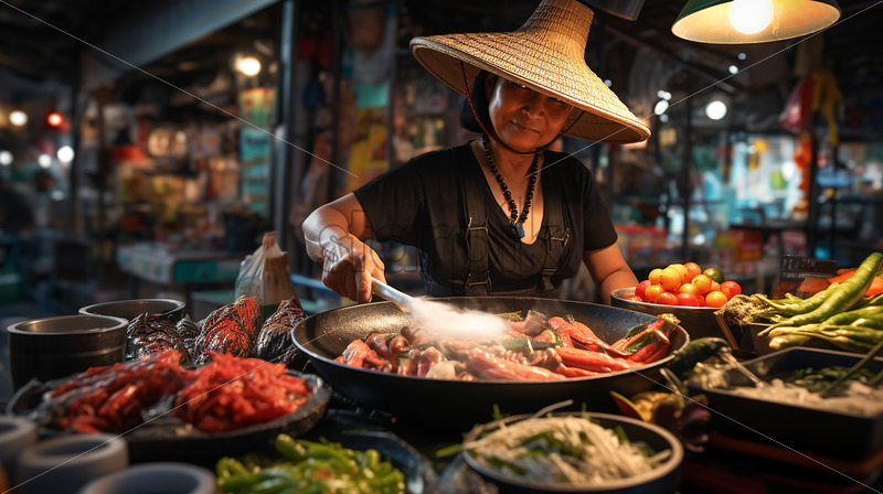 Female Thai’s Vendor in front of his merchandise in the street of Bangkok cooking in front of her costumer