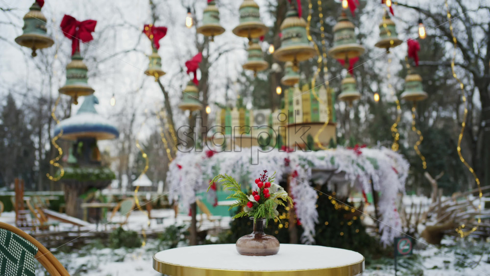 Festive winter decoration with red berries displayed on a table in an outdoor park cafe