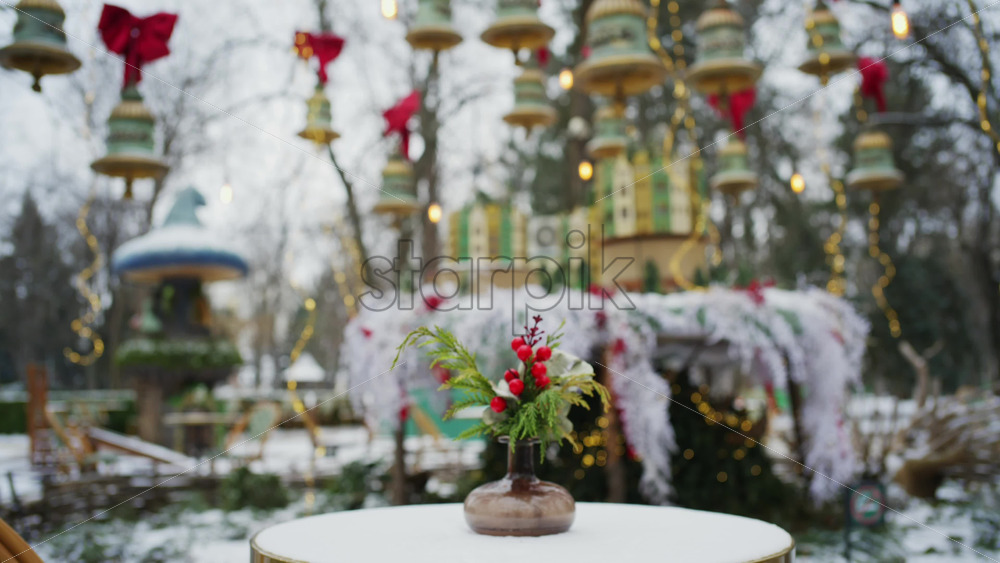 Festive winter decoration with red berries displayed on a table in an outdoor park cafe