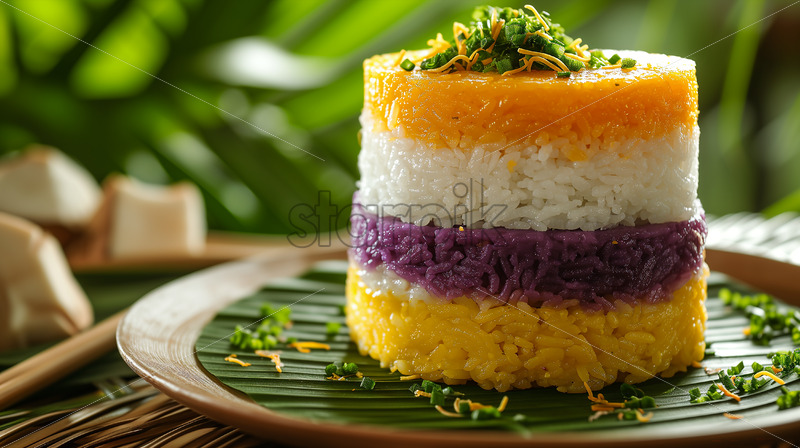 The artful layers of Filipino rice and coconut dessert unfold, with a luscious white coconut layer contrasting beautifully with a vivid purple ube layer in the native style