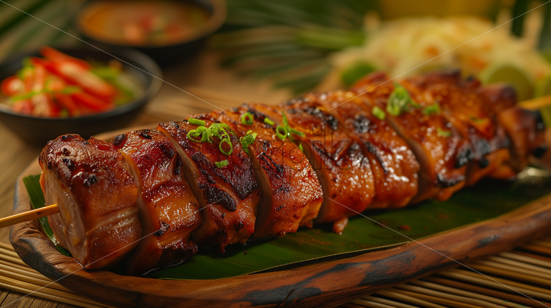 Filipino pork belly steals the spotlight, its entirety expertly roasted and skewered on bamboo, promising a crispy and flavorful culinary delight