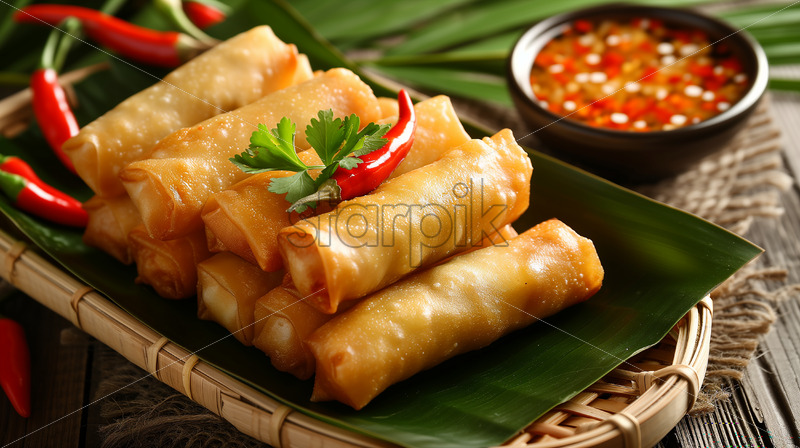 In this enticing photo, Filipino green chili pepper spring rolls take center stage, accompanied by a flavorful dipping sauce of red chili pepper and tangy vinegar
